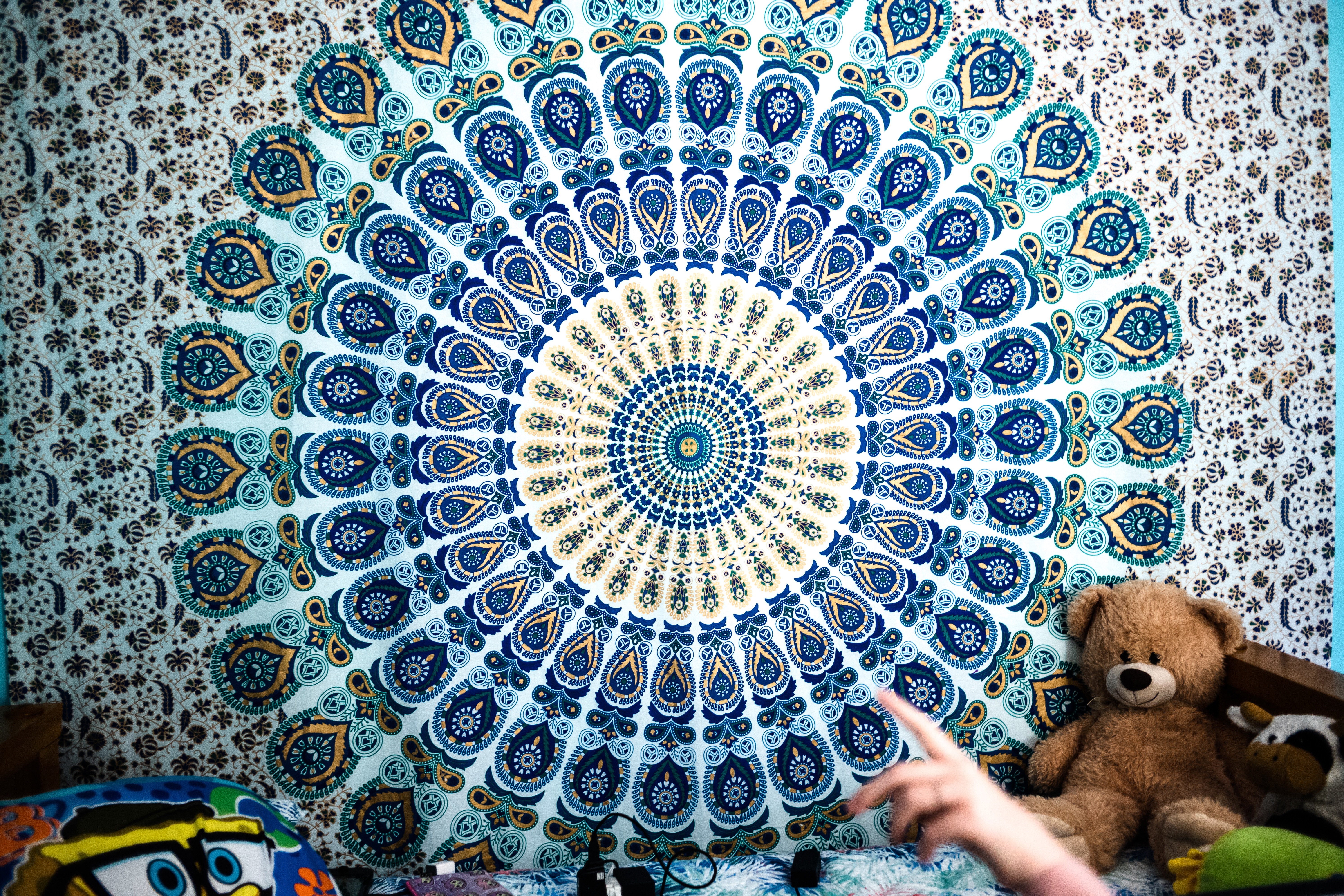 This photograph captures a vibrant tapestry adorned with intricate blue and cream patterns, serving as a captivating backdrop. A gentle, relaxed mood is conveyed through the soft lighting and the cute teddy bear resting beside a playful display of color. The composition highlights the contrast between the intricate design and cozy elements, inviting a sense of warmth and nostalgia.