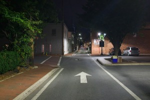A serene, dimly lit street at night invites contemplation, framed by leafy trees and historic brick buildings. The soft glow of street lamps casts gentle shadows, while an arrow painted on the road leads the eye deeper into the scene. The atmosphere is tranquil, evoking a sense of stillness and solitude in the urban landscape.