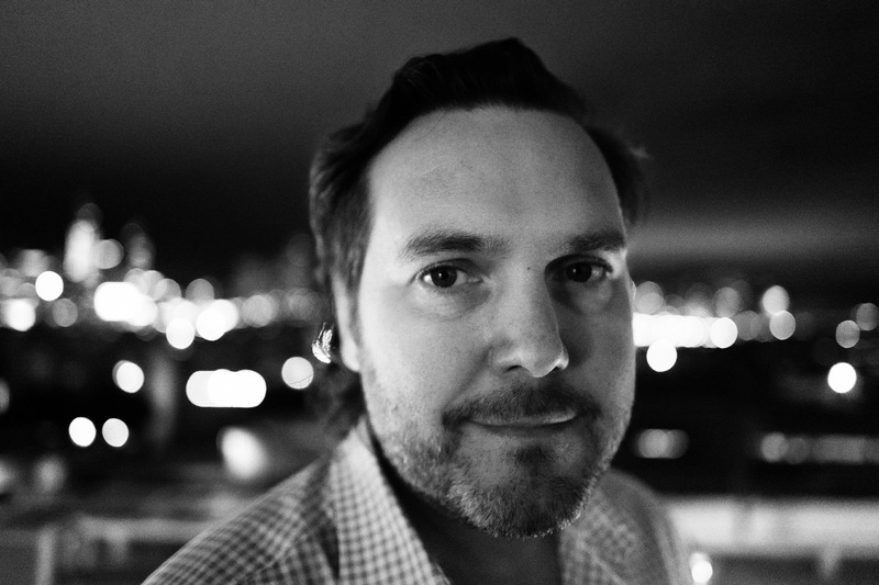 In a captivating black-and-white portrait, the subject's face is illuminated against a backdrop of blurred city lights, creating a striking contrast that adds depth to the image. The soft focus on the city in the background enhances the contemplative mood, inviting viewers to connect with the subject's serene expression. The composition draws attention to the man's features, making this a powerful exploration of presence amidst the chaos of urban life.