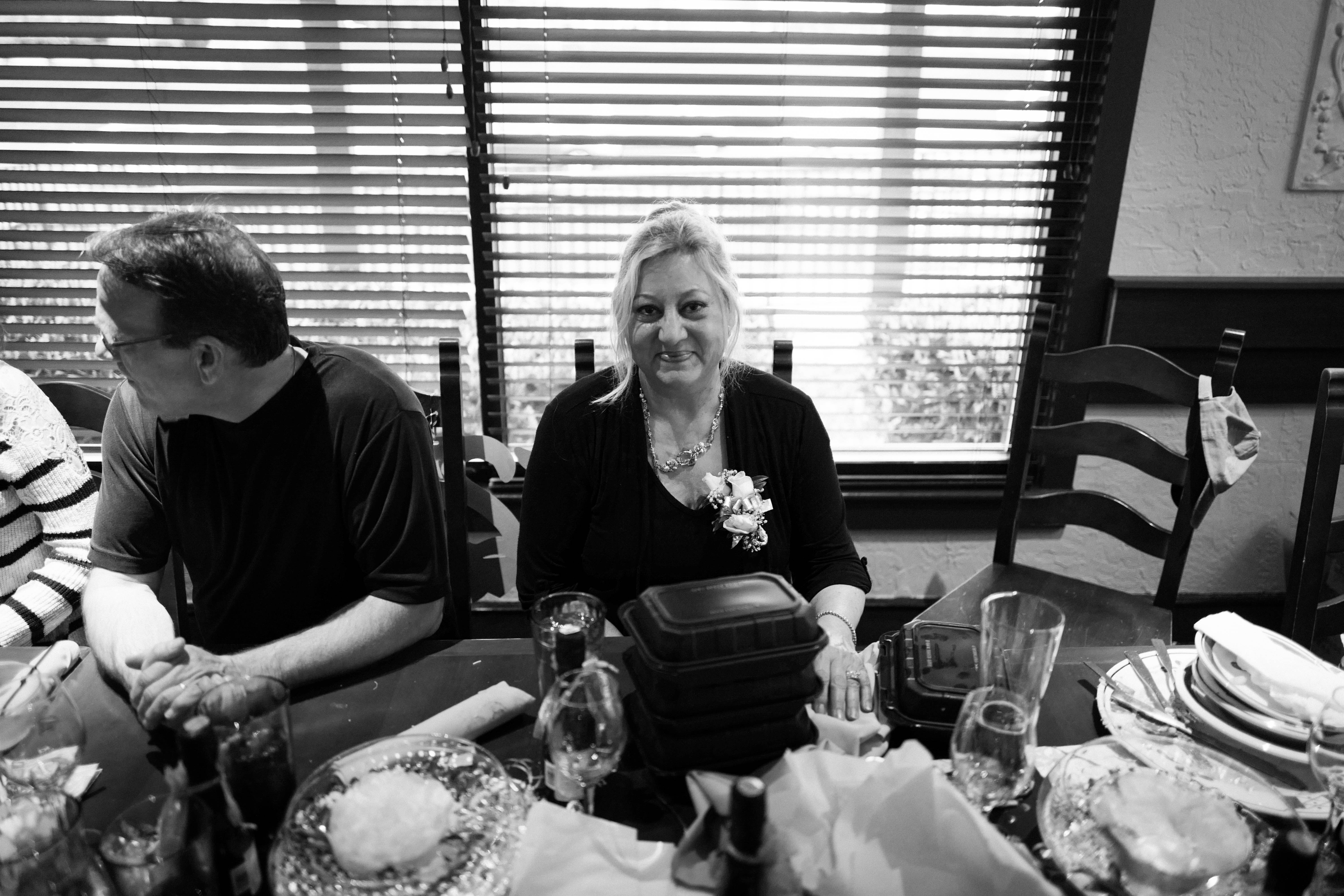 In a warmly lit restaurant, a woman sits amidst a lively gathering, her gentle smile radiating warmth and connection. The monochrome palette accentuates the intimate atmosphere, while the cluttered table hints at shared stories and laughter. Soft shadows dance around her, framing a moment that feels both personal and communal.
