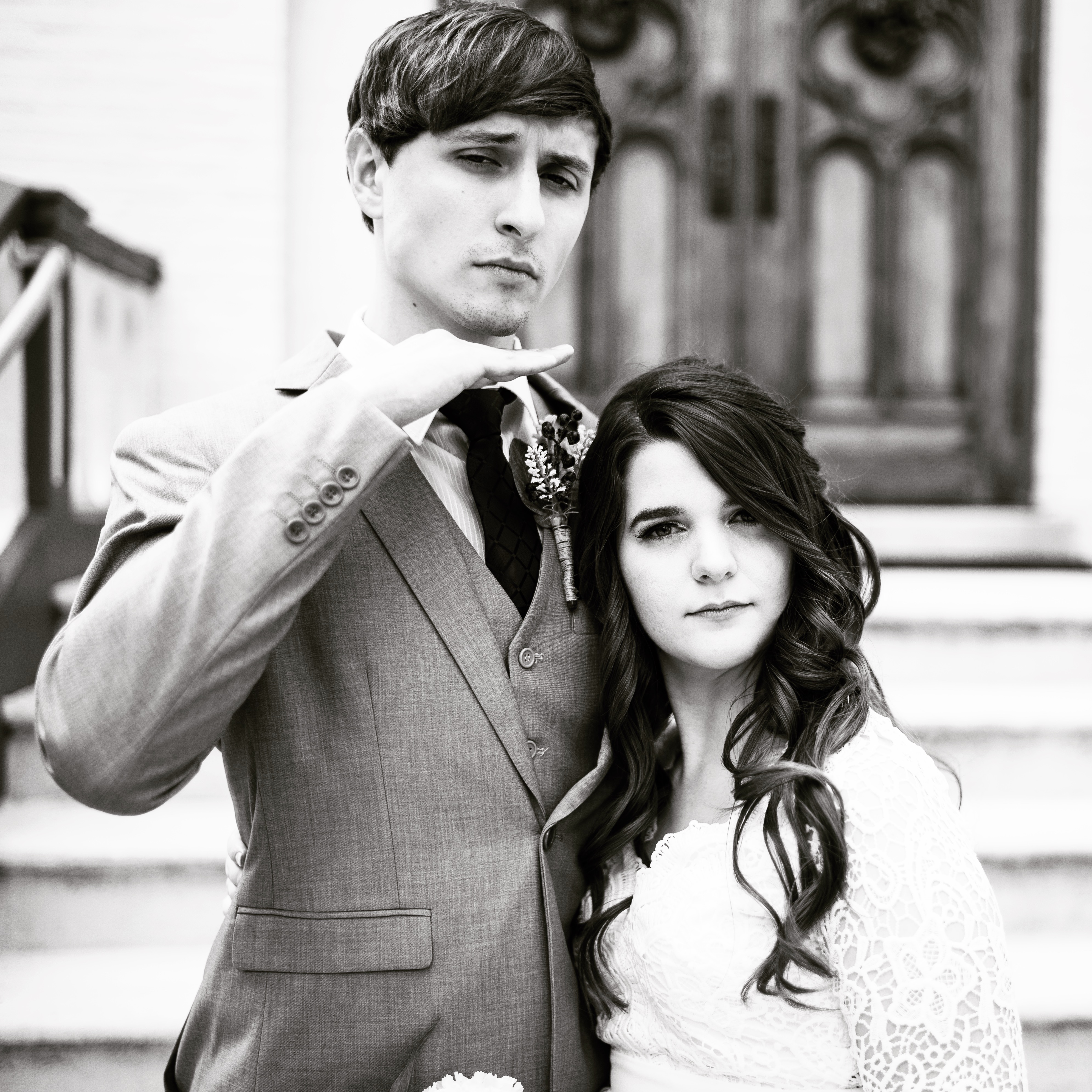 In this striking black-and-white portrait, a confident couple stands side by side against a backdrop of ornate wooden doors. The groom exudes a playful yet sophisticated charm with his pose, while the bride's gaze is steady and reflective, creating a dynamic tension. Soft lighting enhances their features, providing a sense of intimacy and timelessness to the image.