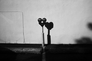 In this striking black-and-white composition, a lone parking meter stands against a blank wall, casting a heart-shaped shadow that evokes a sense of unexpected warmth. The stark lighting creates a dramatic contrast, highlighting the meter's features while keeping the background subtly muted. The mood intertwines simplicity with an intriguing sense of whimsy, inviting viewers to find beauty in everyday life.