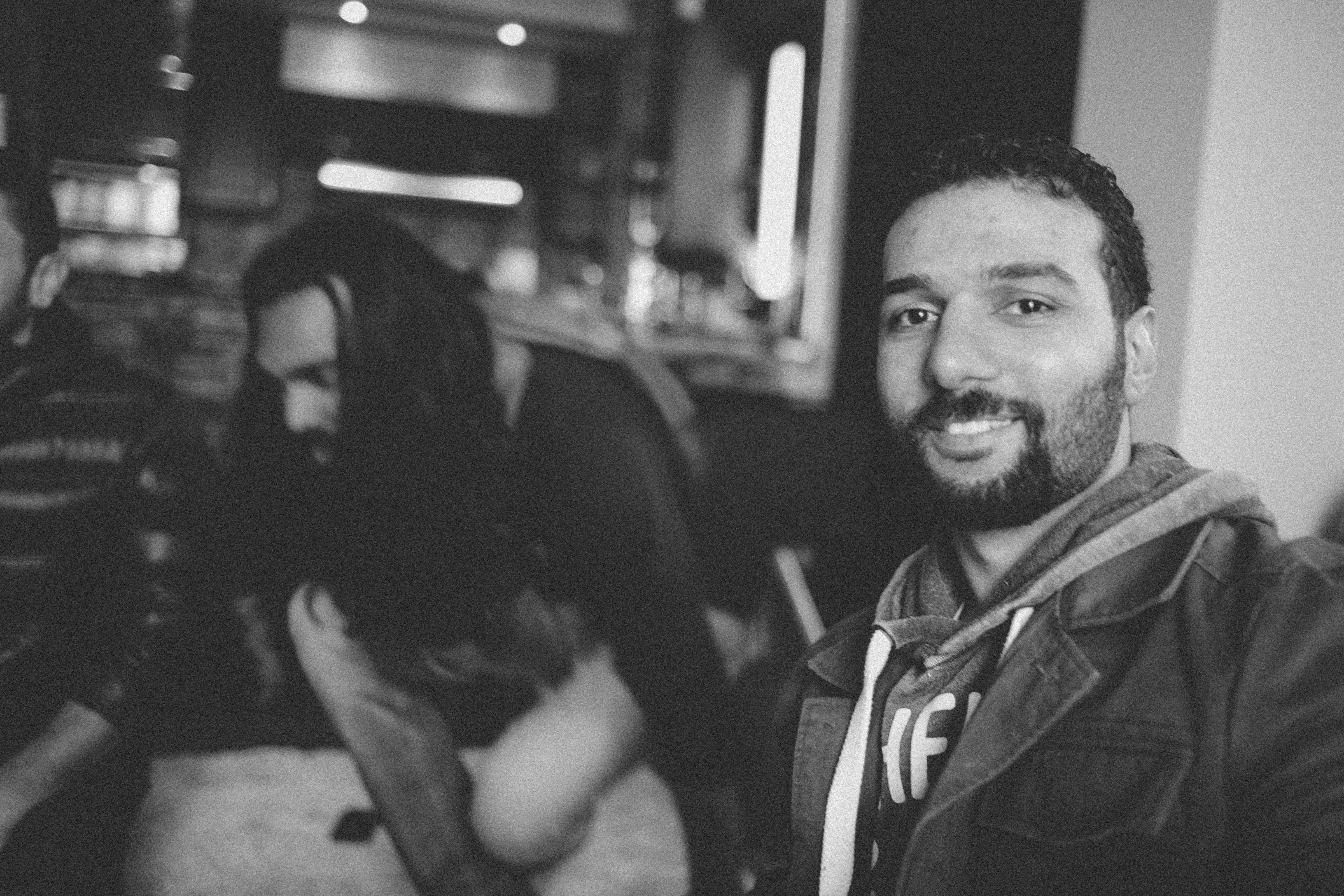 In a cozy indoor setting, a man smiles confidently at the camera, his expression capturing a moment of joy and camaraderie. The background features blurred figures and soft lighting, creating an intimate and relaxed atmosphere. The monochromatic tones add a nostalgic quality, emphasizing the warmth of shared experiences.