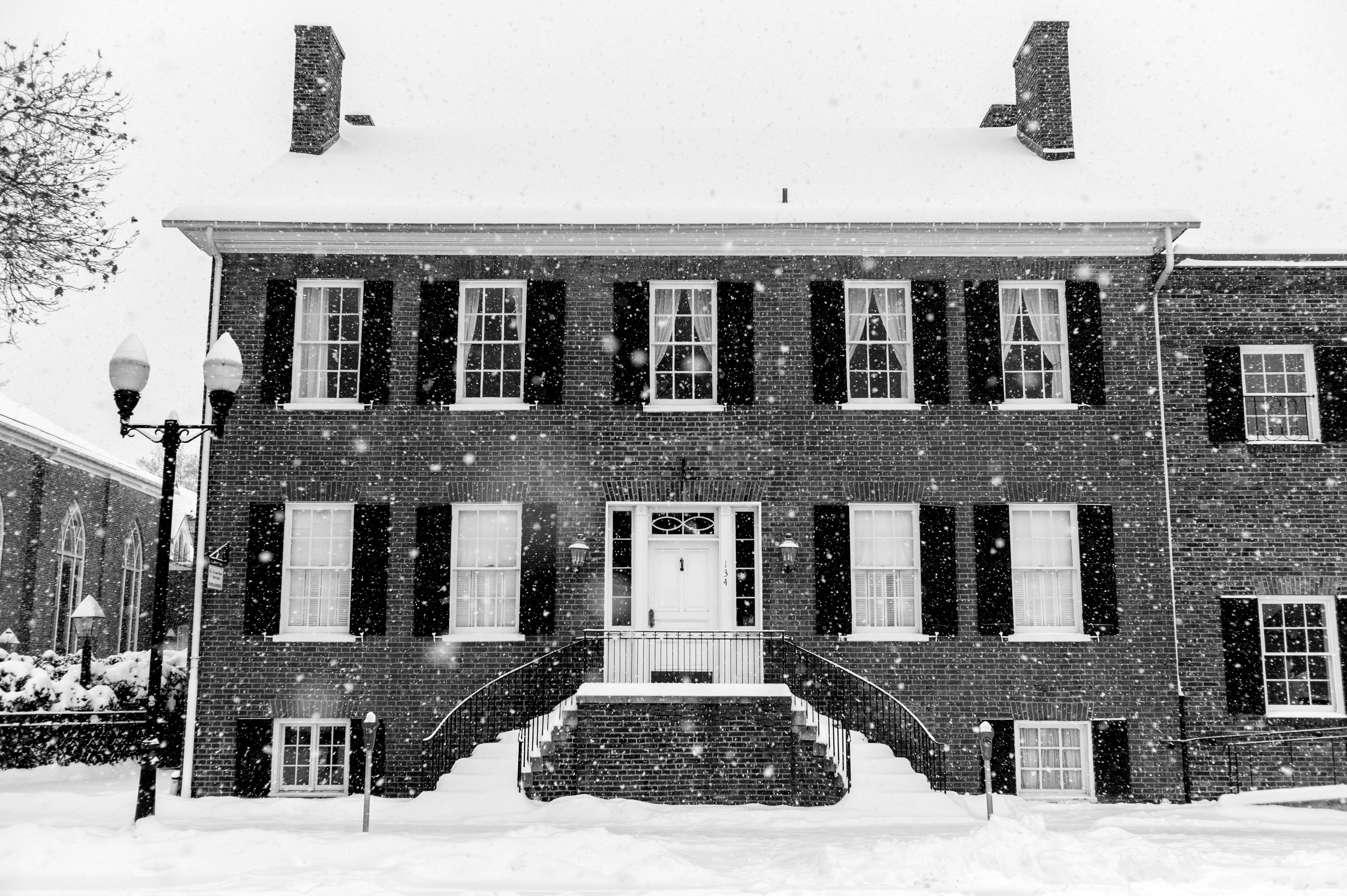This striking photograph captures a stately brick building blanketed in snow, evoking a sense of quiet nostalgia. The monochromatic palette enhances the serene yet melancholic atmosphere, while snowflakes gently cascade through the frame, adding depth and texture. The symmetrical composition, with its prominent front stairs, guides the viewer's eye to the welcoming entrance, contrasting with the harshness of the wintry scene.