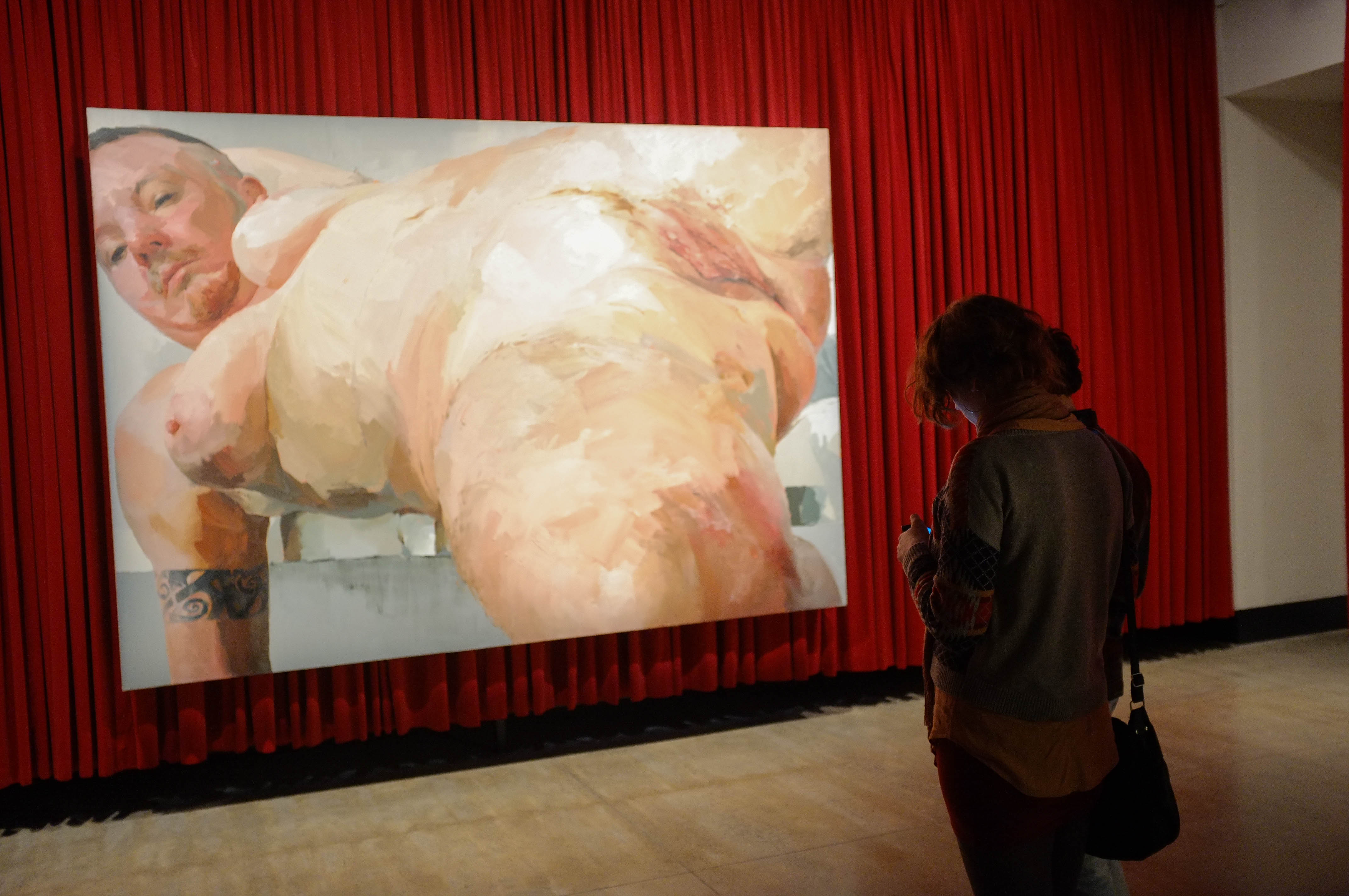 In a gallery setting, a striking large-scale painting of a nude figure dominates the composition, partially obscuring the subject’s face while displaying a raw, unfiltered perspective of the body. The rich crimson curtains in the background evoke a dramatic mood, contrasting with the soft, natural hues of the artwork. A woman stands engrossed in contemplation, her figure silhouetted against the painting, inviting viewers to explore themes of vulnerability and observation.