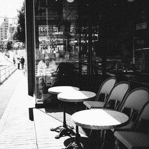 In this monochrome photograph, a solitary figure sits inside a café, absorbed in their own world while capturing a moment of stillness. The interplay of light and shadow creates a stark yet inviting atmosphere, with the empty chairs hinting at stories and conversations that have filled the space. Outside, the blurred movement of passersby adds a sense of life and contrast to the intimate scene within.