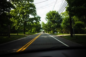 This photograph captures a tranquil scene of a tree-lined road stretching into the distance, inviting the viewer into a moment of fleeting serenity. Bathed in soft, natural light, the vibrant greens of the leaves contrast beautifully against the gray asphalt, evoking a sense of calm and exploration. The composition draws the eye along the curving path, suggesting a journey filled with possibilities in a peaceful, suburban landscape.