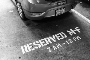 This photograph captures a close-up view of a parked car paired with stark, white parking markings on a concrete surface. The monochrome palette enhances a sense of urban solitude and evokes a feeling of quiet contemplation. The composition highlights both the car and the reserved sign, drawing attention to the interplay between personal space and city regulations.