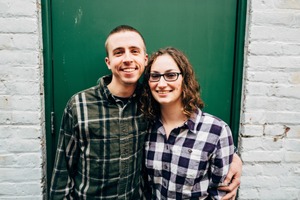 In this vibrant photograph, two friends stand closely together, exuding warmth and joy against a striking green door. The plaid shirts add a casual charm, while soft, natural lighting accentuates their cheerful expressions, creating a friendly and inviting atmosphere.
