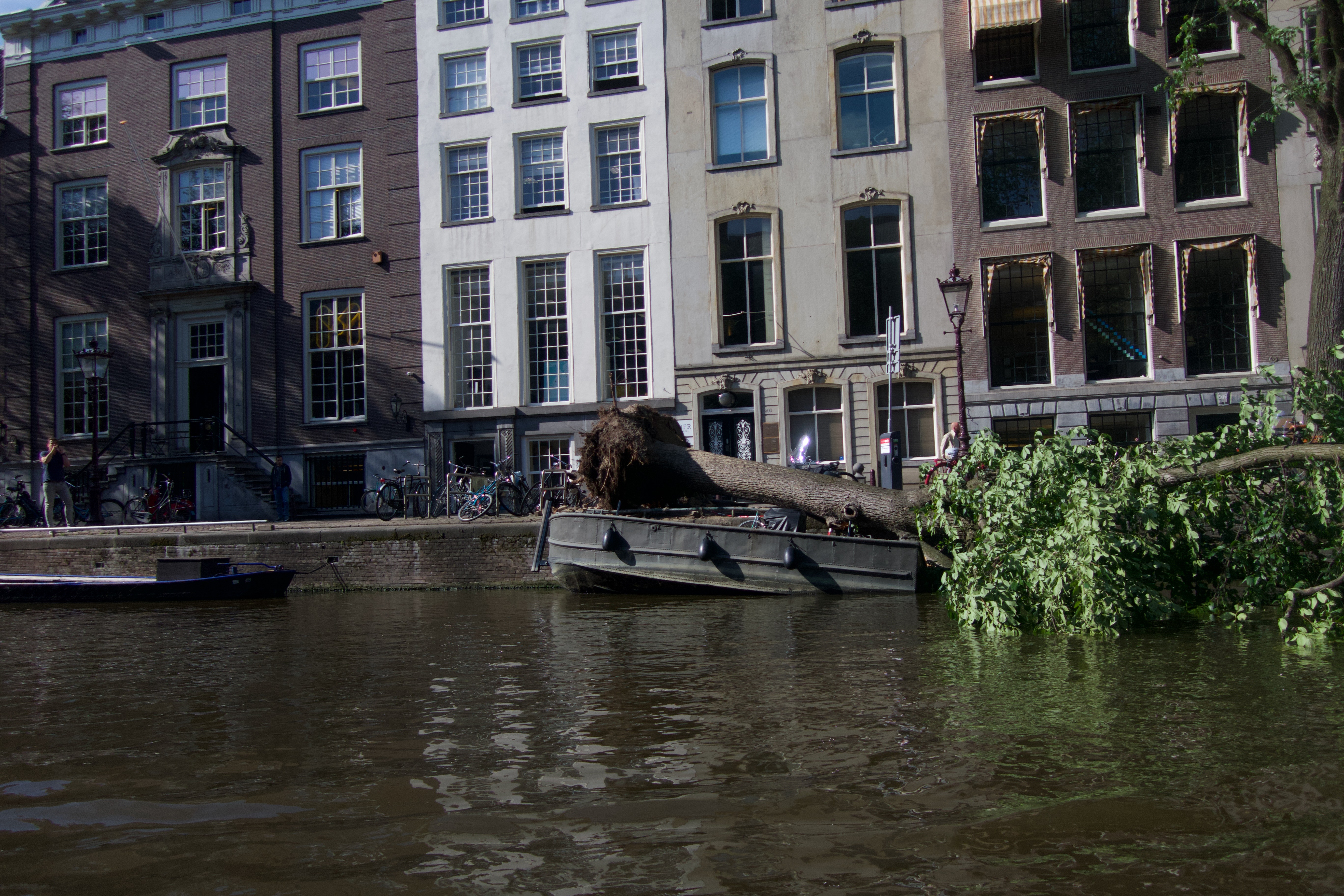 A fallen tree sprawls across a canal, its roots exposed, juxtaposed against the sturdy, elegant architecture of Amsterdam's buildings. The scene is captured in bright daylight, casting reflections on the water's surface and enhancing the contrasting textures of nature and urban life. Bicycles are parked along the bank, hinting at the everyday life continuing around this striking reminder of nature's power.
