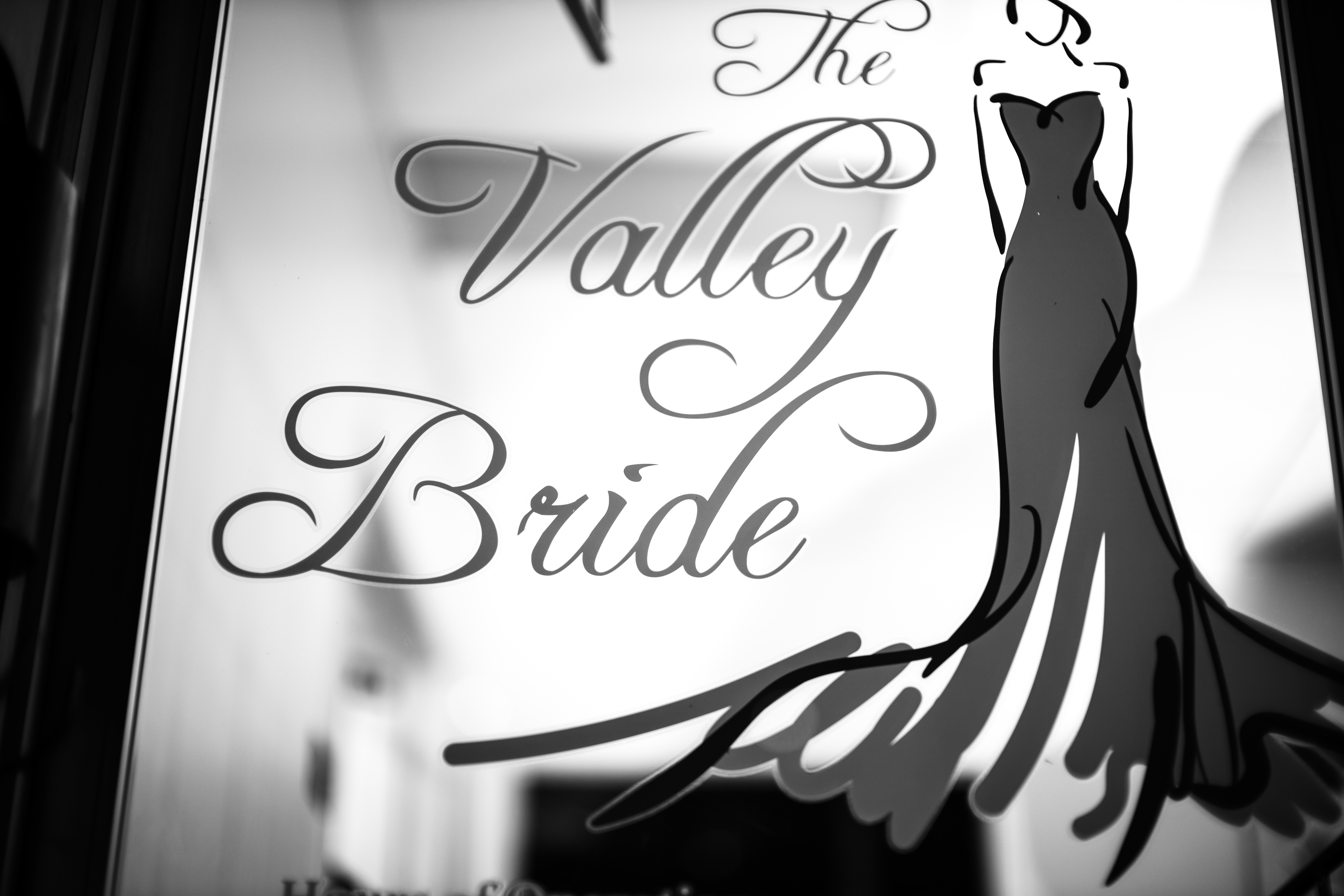 This photograph features a window display showcasing the name 'The Valley Bride' alongside an elegant silhouette of a wedding dress. The black and white composition adds a timeless quality, emphasizing the graceful lines of the dress and the soft curves of the lettering. The serene mood invites the viewer into a space dedicated to bridal elegance and celebration.