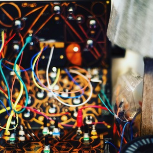 This photograph captures a close-up view of a complex circuit board adorned with colorful wires, evoking a sense of chaotic creativity. The warm lighting enhances the intricate patterns, drawing the eye to the interwoven connections that suggest an underlying rhythm and potential for sound. The blurred edges add an artistic softness, contrasting with the sharp details of the components, creating a mood that is both energetic and contemplative.