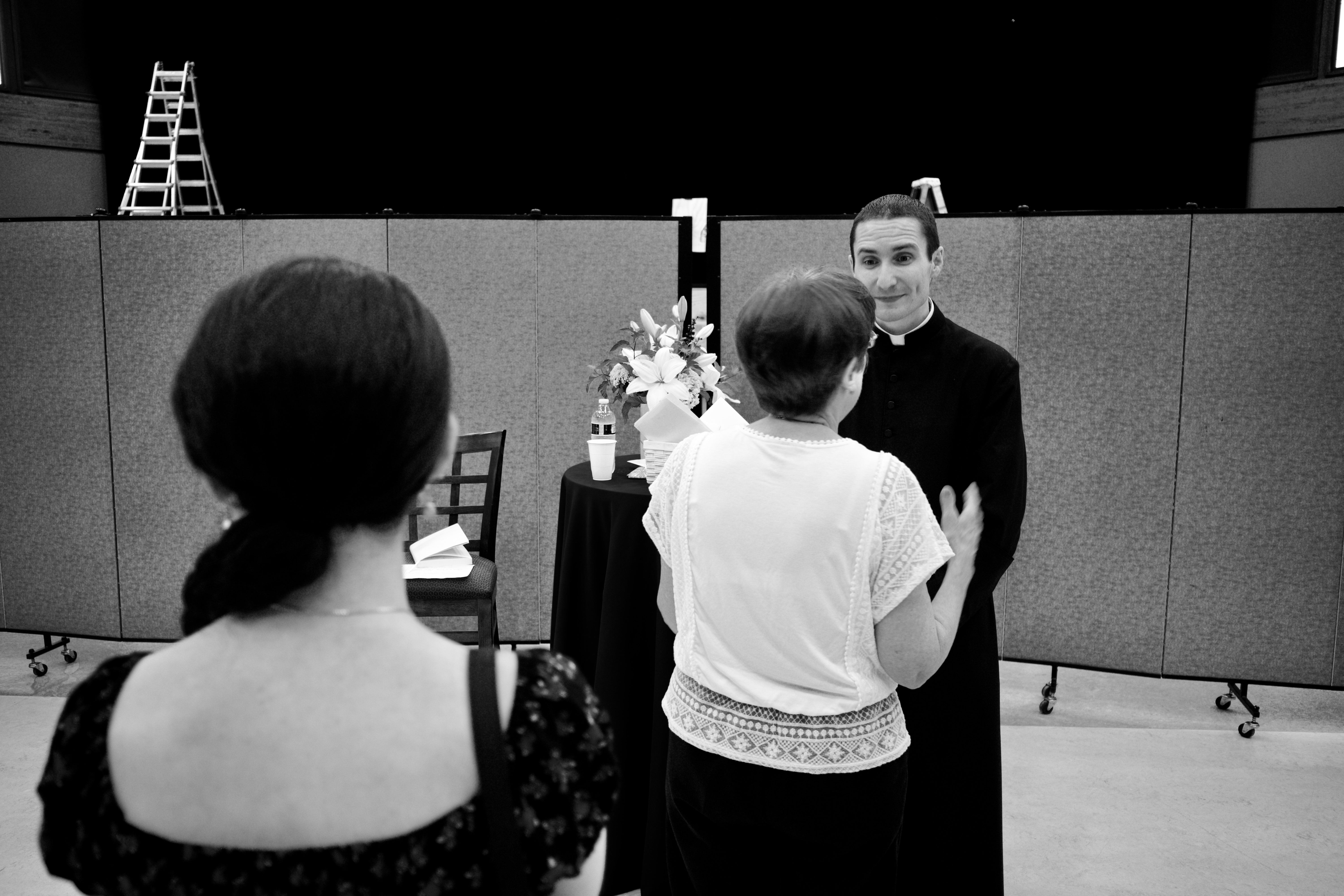 In a dimly lit hall, two figures engage in a candid conversation, drawing attention against a muted backdrop of partition walls. The black-and-white palette emphasizes their expressions, reflecting a mix of curiosity and seriousness, while a subtle spotlight hints at an intimate gathering. A ladder in the background adds an intriguing layer of context, suggesting preparations or transitions in this moment.