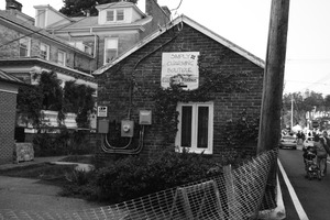 This black-and-white photograph captures a quaint boutique nestled among larger buildings, its simplicity exuding a nostalgic charm. The mood is somewhat somber yet inviting, enhanced by the soft evening light that gently illuminates the brick façade. A mesh fence adds a layer of urban texture, framing the scene as it plays host to passersby in the distance, suggesting life and community nearby.