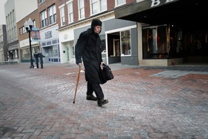 A lone figure dressed in dark clothing trudges along a brick-lined street, capturing a sense of solitude and contemplation. The muted colors of the buildings enhance the somber mood, while the soft, overcast lighting creates a melancholic atmosphere. The man's cane and bag suggest purpose, yet his demeanor reflects a quiet introspection against the backdrop of a bustling yet empty town.