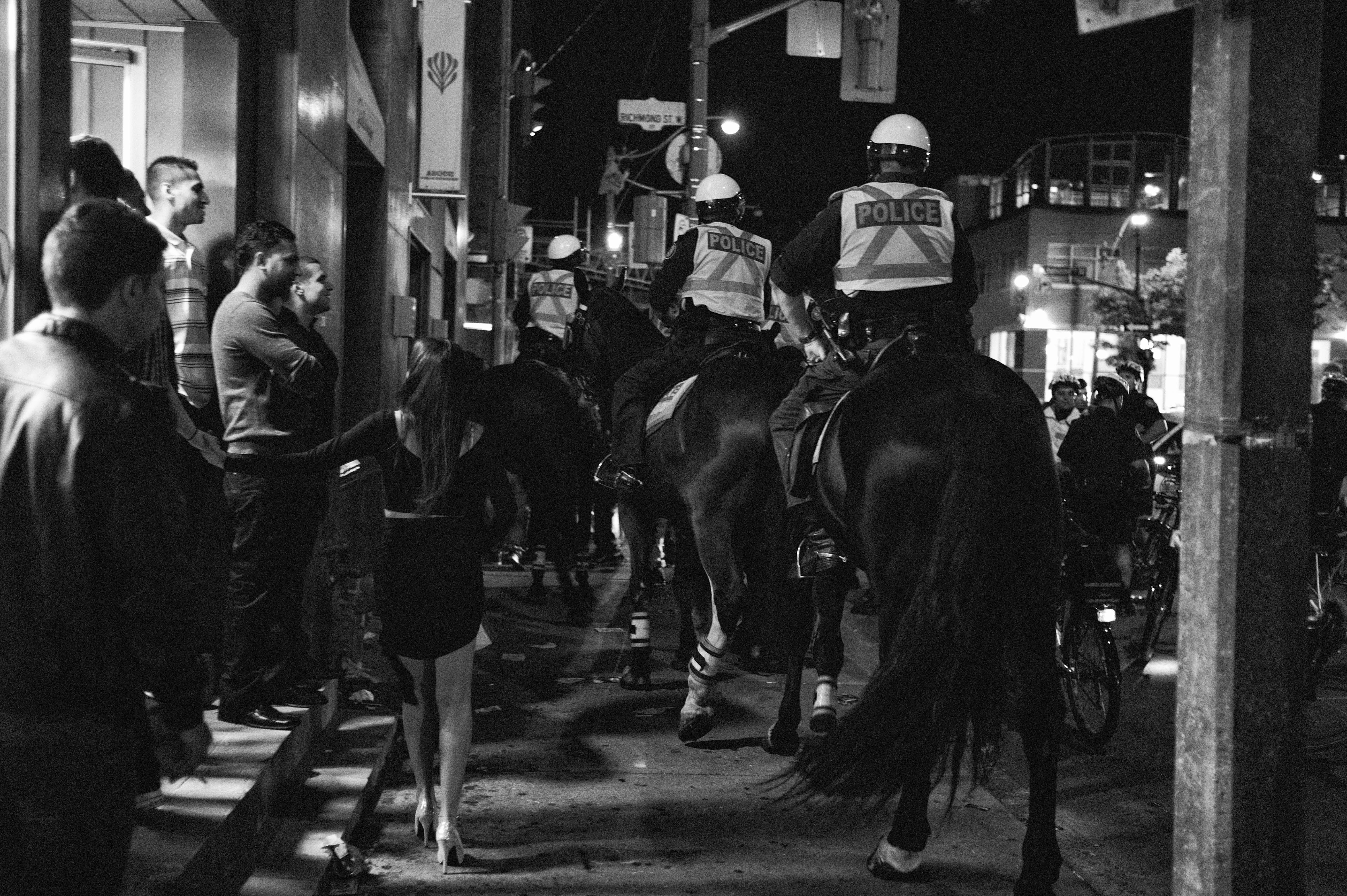 The photograph captures a tense urban scene at night, where police on horseback navigate a crowded street filled with onlookers. The stark black-and-white contrast enhances the mood, evoking a sense of unease and vigilance among the figures on the sidewalk. Shadows stretch and blend into the dimly lit atmosphere, amplifying the feeling of a watchful presence in the city.