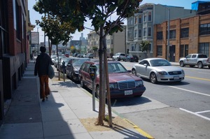 A solitary figure walks along a sunlit sidewalk, framed by vibrant greenery and a line of parked cars. The warm hues of the day contrast with the cool shadows cast by the buildings, evoking a leisurely pace. This scene captures the essence of urban life, blending nature with the concrete landscape.