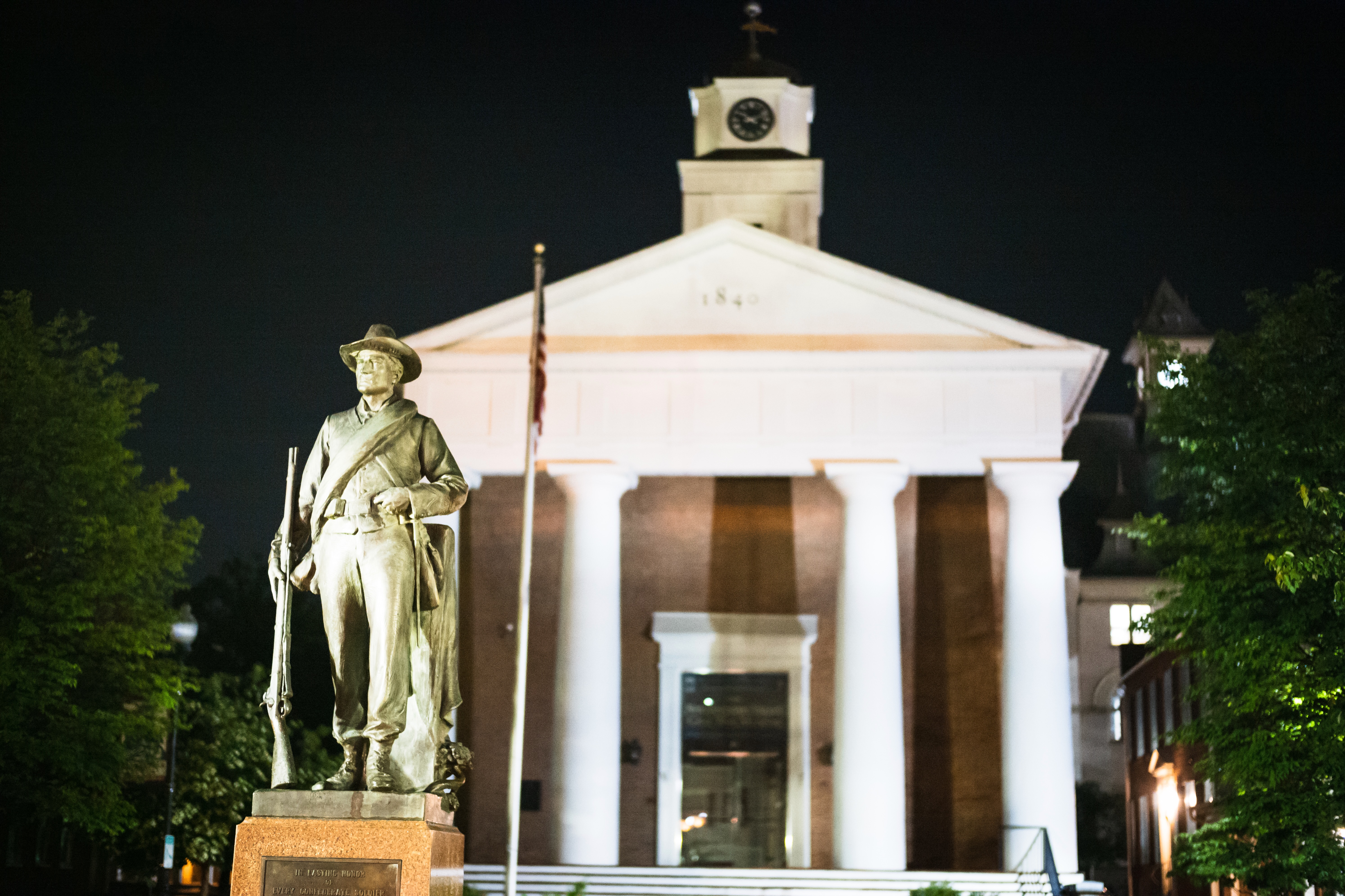 A bronze statue of a soldier stands resolutely in the foreground, illuminated under the stark glow of artificial lights. The imposing structure of a historic building looms behind, its classic columns and clock tower presented in sharp contrast against the night sky. The scene evokes a sense of solemnity and reflection, merging history with a quiet moment frozen in time.