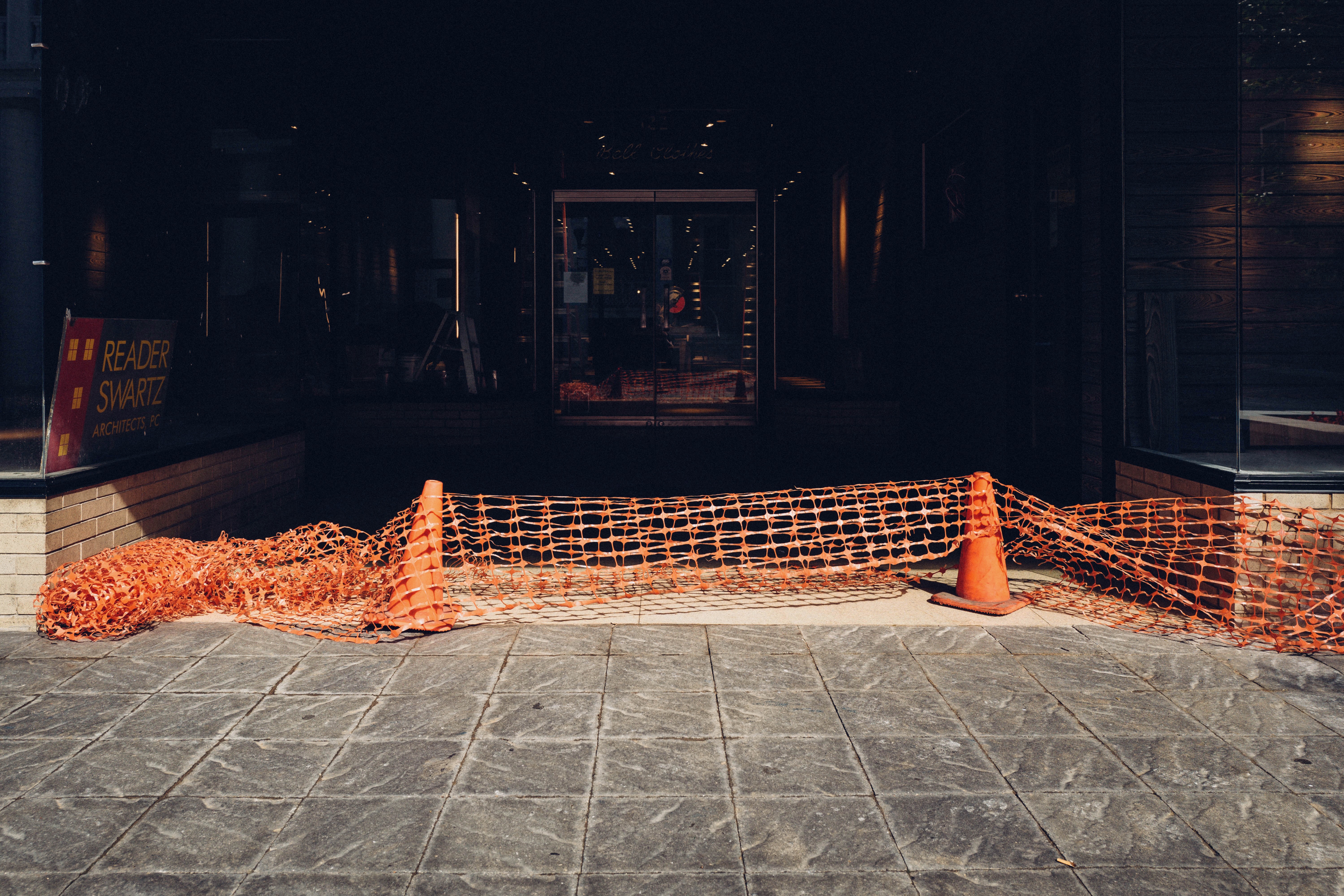 A striking contrast between vibrant orange safety barriers and the shadowy entrance of a building evokes a sense of confinement and anticipation. The soft lighting gently illuminates the textures of the pavement and netting, while the darkened interior suggests mystery beyond the threshold. This composition captures a moment of pause, inviting viewers to reflect on what lies behind the barricade.