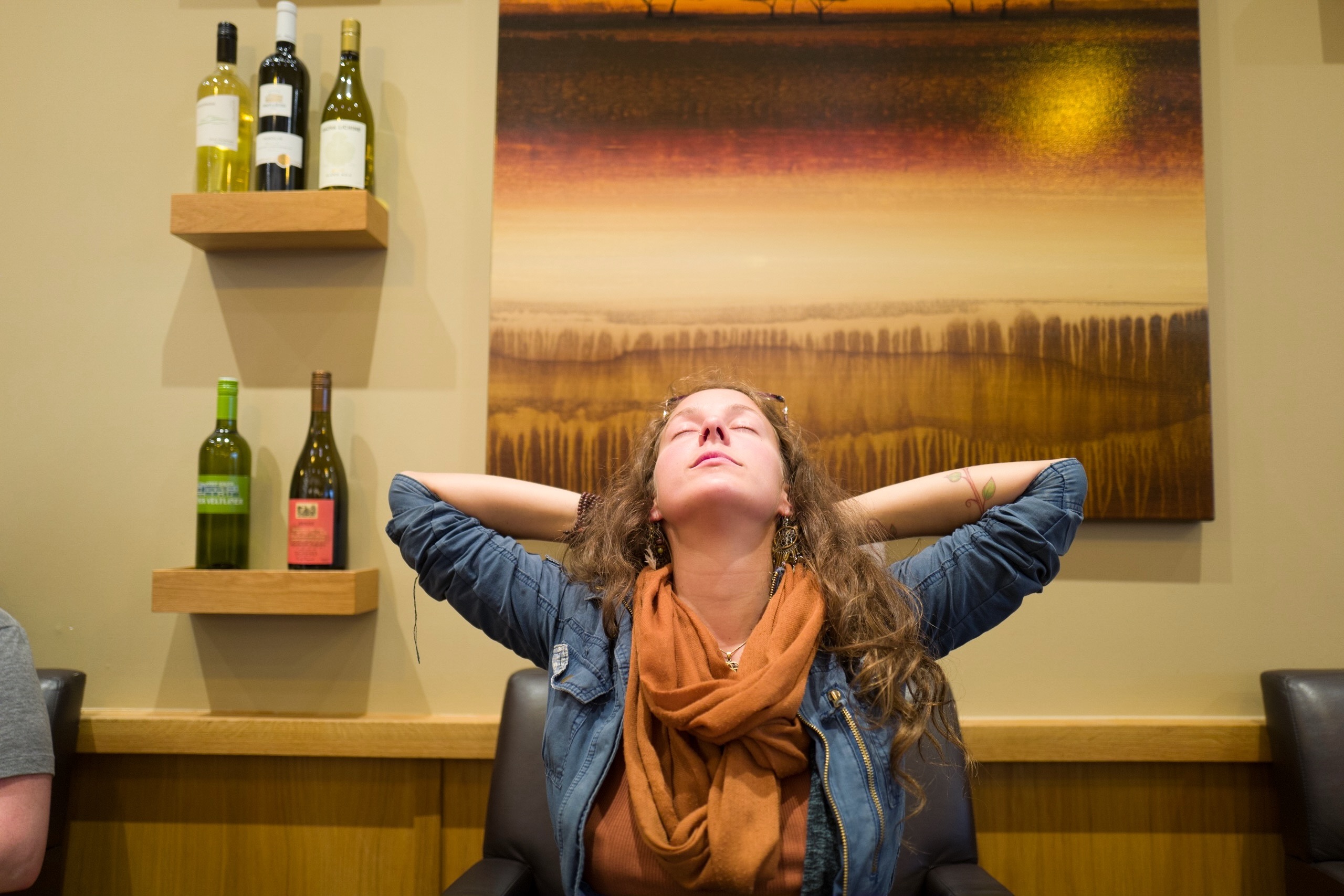 A woman leans back in a chair, exuding a sense of calm and contemplation. The warm lighting and earthy color palette create an inviting atmosphere, accentuated by the bottles of wine above her. This intimate composition draws the viewer into her moment of relaxation against a backdrop of tranquil artistry.