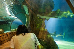 A figure stands near the edge of an aquarium tunnel, gazing at the majestic sharks gliding gracefully through the water. The soft blue lighting casts an ethereal glow, enhancing the feeling of wonder and tranquility. The interplay of shadows and reflections creates a captivating atmosphere, inviting viewers into the mysterious underwater world.