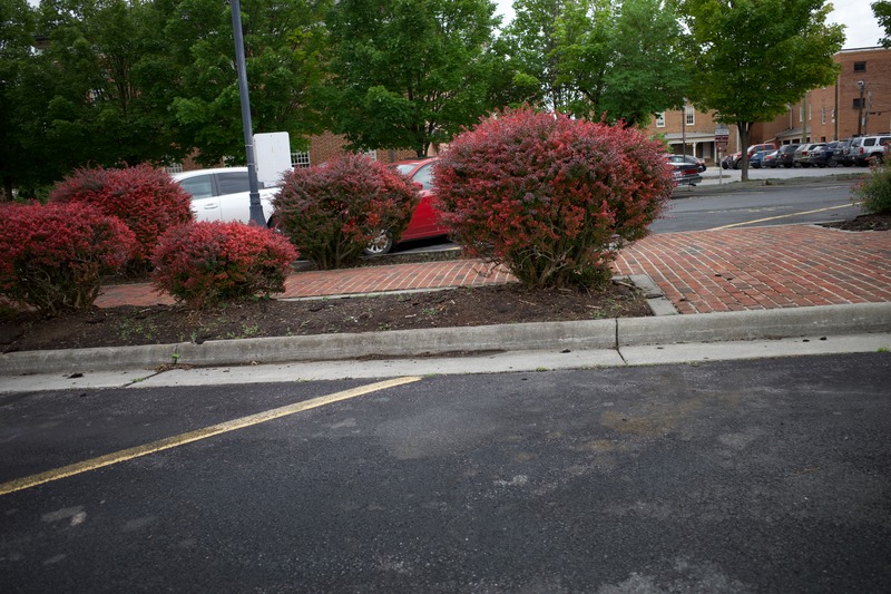 This photograph captures a vibrant arrangement of red bushes, positioned along a brick pathway adjacent to a paved parking area. The muted overcast lighting enhances the rich colors of the foliage, creating a calm yet invigorating urban landscape. The juxtaposition of lush greenery against the asphalt symbolizes life in a bustling setting, inviting contemplation of nature within the city.