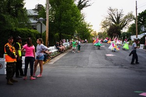 A lively parade scene unfolds on a tree-lined street, with enthusiastic participants in vibrant costumes spinning joyfully. The soft evening light casts a warm glow, enhancing the cheerful atmosphere as spectators sit eagerly along the neatly arranged white chairs. A sense of community and celebration is palpable, showcasing the joyous spirit of spring festivities.