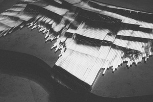 This striking black-and-white photograph captures the intricate lines of a sculptural object, suggesting both motion and stillness. The play of light creates a dynamic contrast, highlighting the texture and depth of the piece while evoking a sense of contemplation. The composition draws the viewer's eyes across the flowing forms, inviting an exploration of the beauty within simplicity.