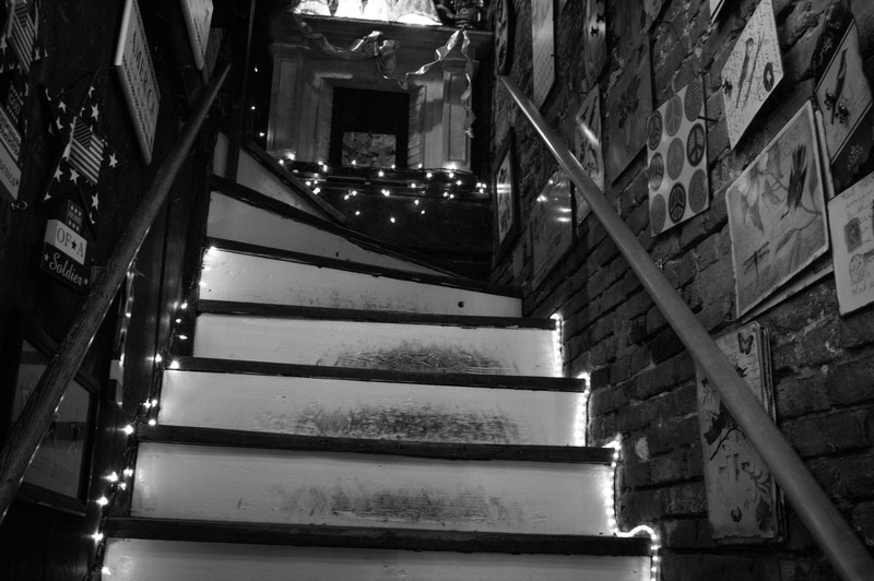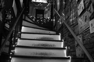 This photograph captures an inviting yet mysterious staircase winding upward, illuminated by soft white lights that accentuate the worn wooden steps. The walls are adorned with eclectic artwork, evoking a sense of nostalgia and creative energy, while the black-and-white tones add a timeless quality. The composition leads the eye upwards, inviting exploration into an unseen world beyond.