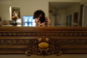 This photograph captures a moment of introspection as the subject, partially obscured by the ornate golden mirror frame, turns the camera towards themselves. The soft, ambient lighting creates a warm, contemplative mood, while the blurred background suggests a familiar, intimate space. The intricate details of the mirror's design contrast beautifully with the simplicity of the scene, inviting viewers to ponder the stories reflected within.