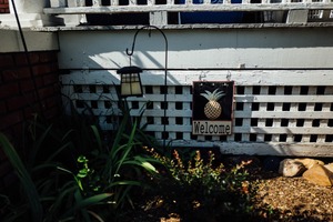 This photograph captures a charming entryway adorned with a wooden 'Welcome' sign featuring a pineapple, symbolizing hospitality. Sunlight filters through, casting subtle shadows and highlighting the vibrant greens of the surrounding plants, creating a warm, inviting atmosphere. The composition balances natural elements with rustic decor, inviting viewers to feel at home.