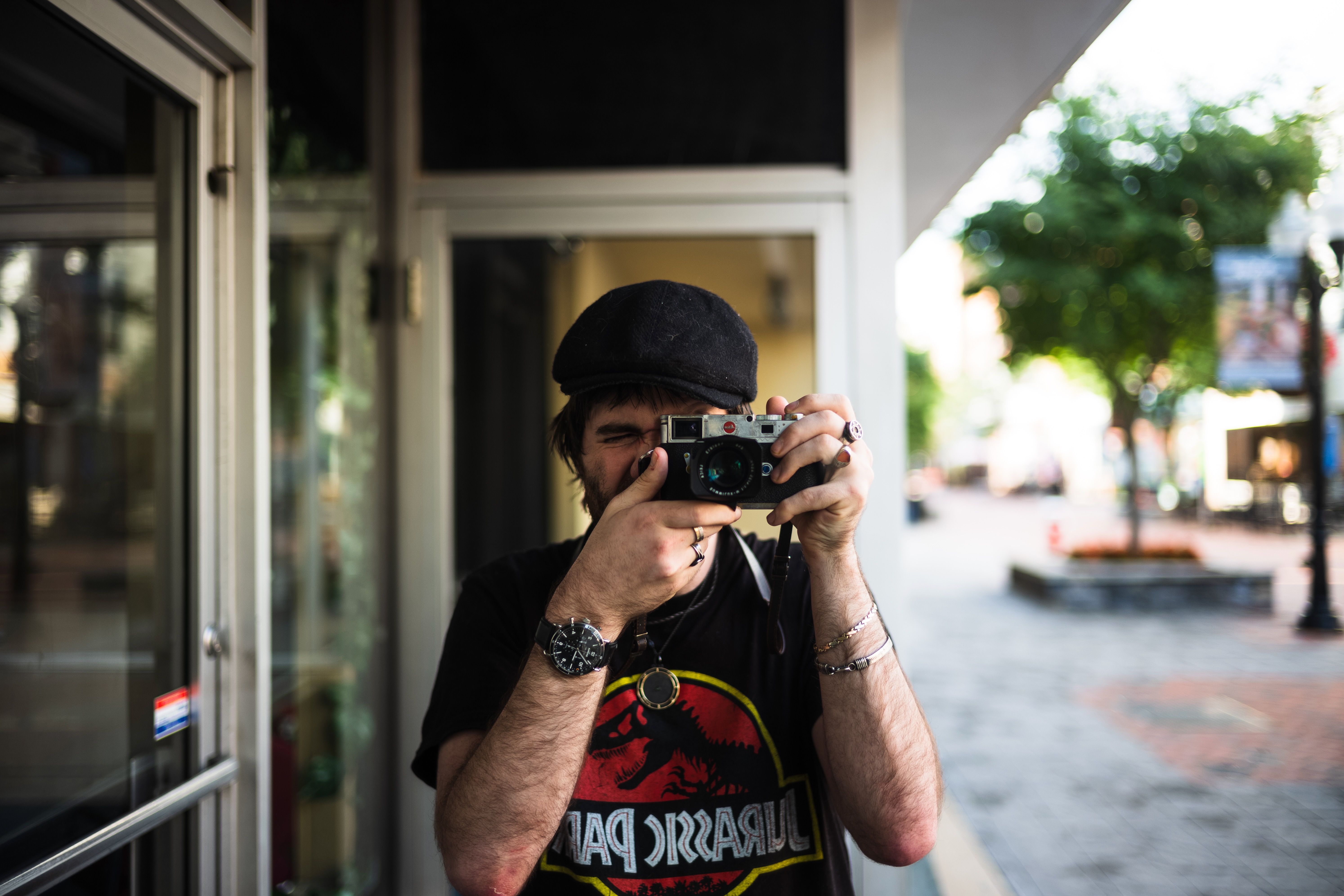 A young man stands in a bustling urban setting, confidently raising a vintage camera to capture the world around him. The soft sunlight filters through the trees, casting a warm glow that complements the relaxed yet focused mood of the moment. With a casual outfit echoing film nostalgia, he embodies a passion for photography, inviting viewers to share in his creative journey.