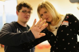 In this candid photograph, a young man and woman are positioned closely, with their hands delicately reaching out toward the viewer. The soft, diffused lighting creates an intimate mood, highlighting their expressions as they engage in a personal interaction. The blurred background enhances the focus on their hands, suggesting a moment of connection or communication between them.