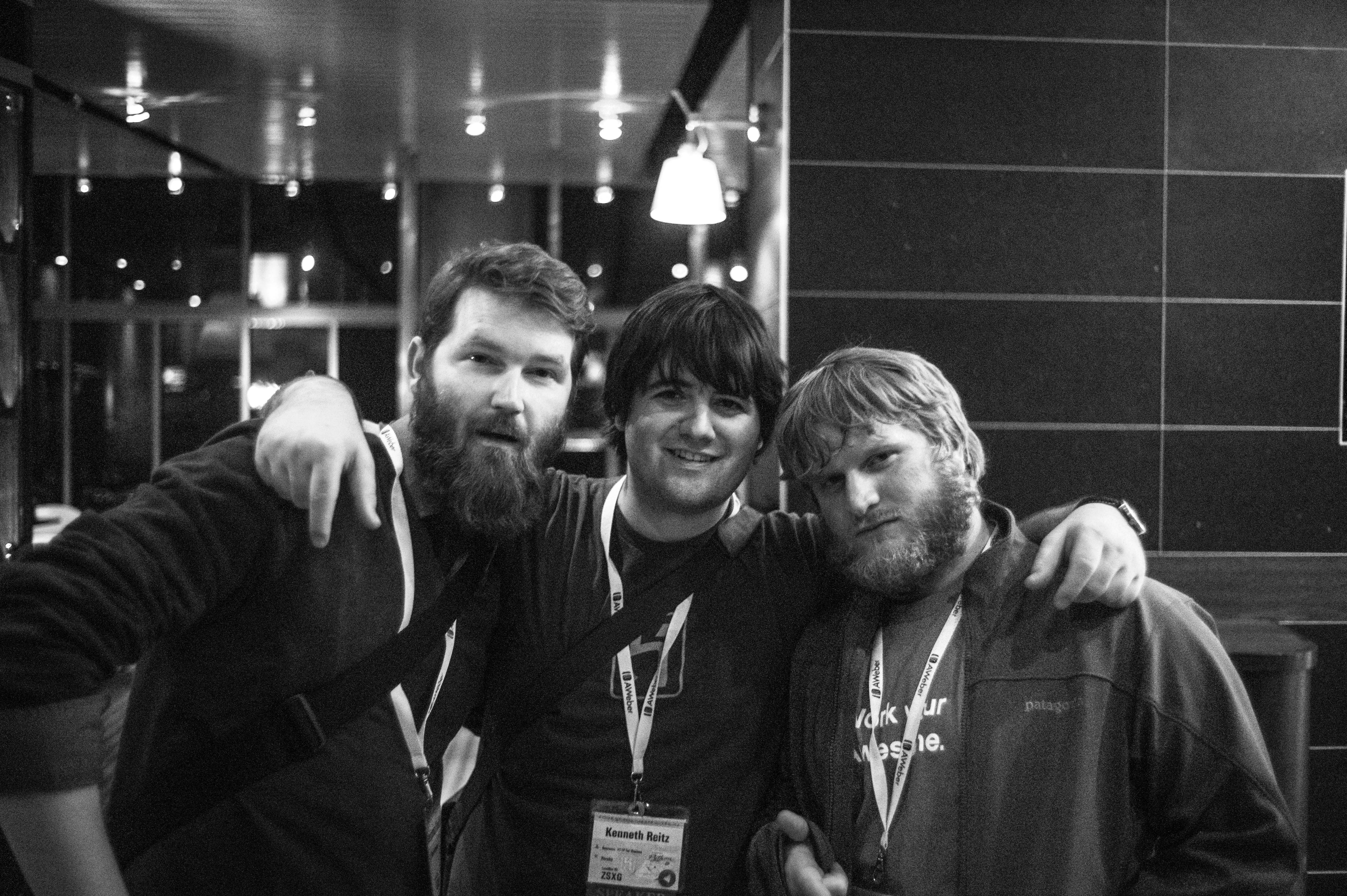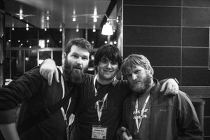 In a cozy, dimly lit environment, three friends stand close together, their smiles radiating warmth and camaraderie. The black and white tones enhance the mood of nostalgia and connection, while the soft glow of overhead lights adds depth to the composition. Each individual sports a distinct beard, embodying a casual and relaxed atmosphere, as they celebrate a moment shared among friends.