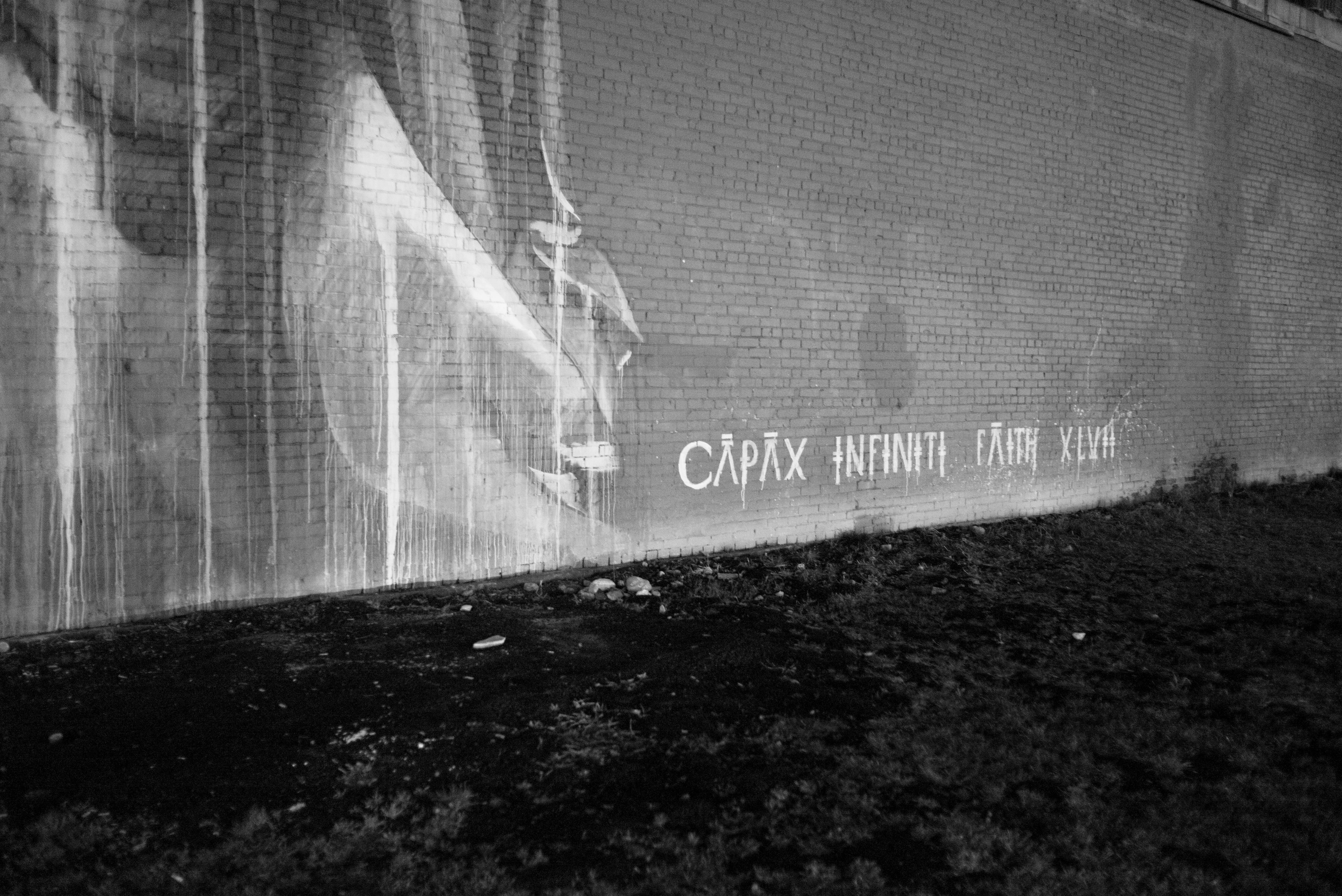 This photograph captures a striking mural on a brick wall, featuring abstract elements that hint at human forms intertwined with graffiti text. The monochrome palette evokes a somber mood, with soft lighting illuminating the piece while shadows add depth and texture. The scene feels both ephemeral and haunting, inviting contemplation in a forgotten urban landscape.