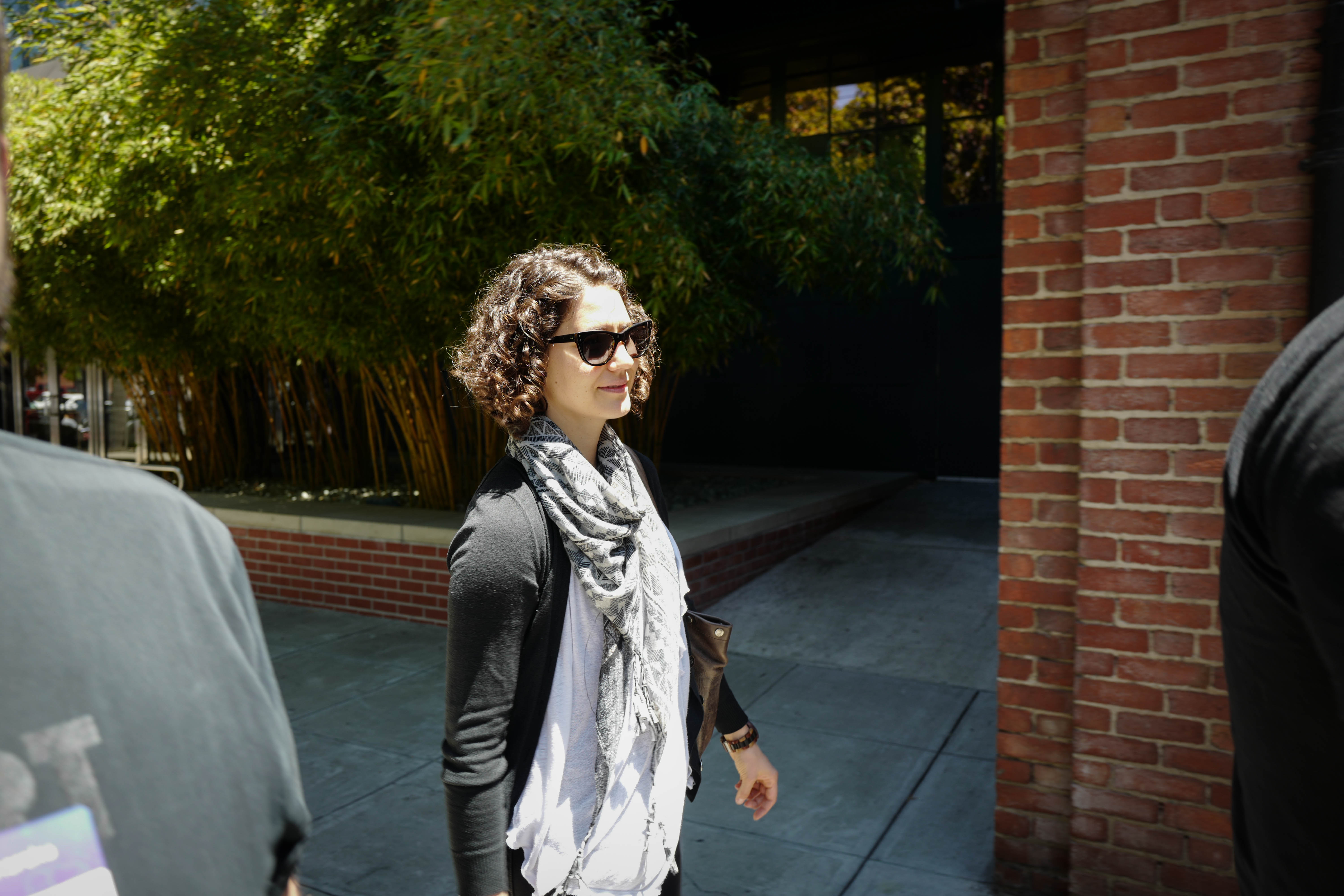 The photograph captures a woman walking confidently through a sunlit urban space, framed by lush green bamboo and textured brick. Her stylish outfit, completed with sunglasses and a scarf, adds an air of casual sophistication. The interplay of light and shadow creates a vibrant atmosphere, highlighting her composed demeanor amidst the bustling city backdrop.