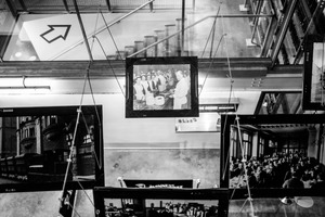 The photograph captures a staggered arrangement of black-and-white images hanging from above, depicting historical moments in a communal setting. The mood is reflective, evoking nostalgia through the interplay of light and shadow, while the angular lines of the staircase and the upward arrow create a sense of movement and progression. This collage invites the viewer to contemplate the stories behind each framed moment in time.