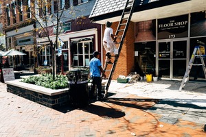 In a vibrant urban setting, two workers engage in a renovation task outside a floor shop, capturing the essence of industriousness. The sun casts a warm, inviting light, highlighting the textured brickwork and the intricate arrangement of plants. The scene is filled with an air of anticipation, showcasing the harmony between labor and the revitalization of the space.