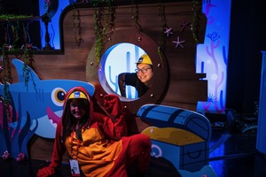 The photograph captures a playful underwater-themed setting where two individuals are joyfully interacting. One person, dressed in a vibrant red costume, poses with enthusiasm, while another peers out from a porthole, showcasing a playful camaraderie. The colorful backdrop and soft lighting create a whimsical and upbeat atmosphere, enhancing the sense of fun and creativity.