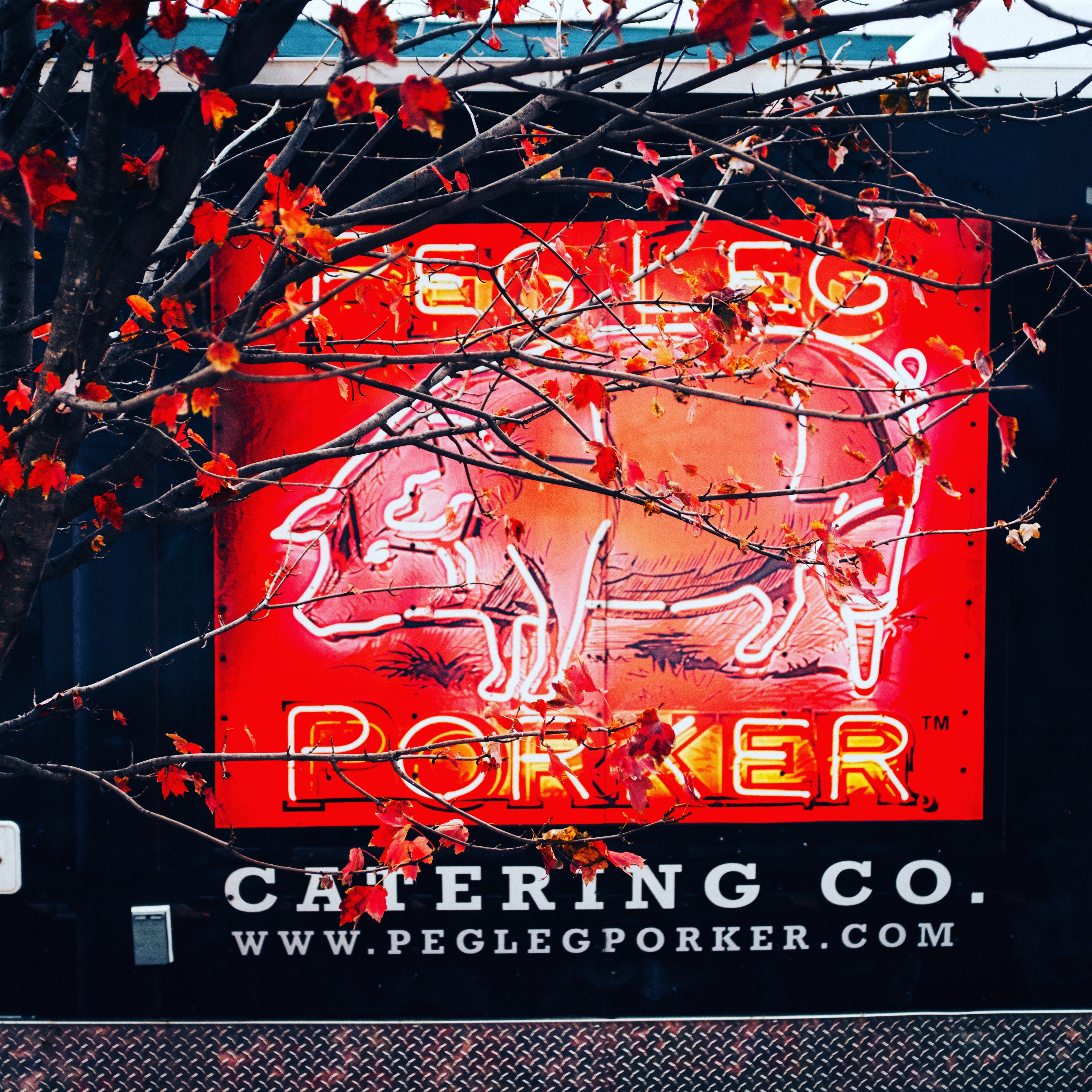 The photograph captures a vibrant neon sign from Peg Leg Porker, framed by the fiery reds and oranges of autumn leaves. The glowing hues contrast sharply against the dark background, creating an inviting yet energetic atmosphere. This composition not only highlights the eclectic charm of food culture but also evokes a sense of warmth and seasonal change.
