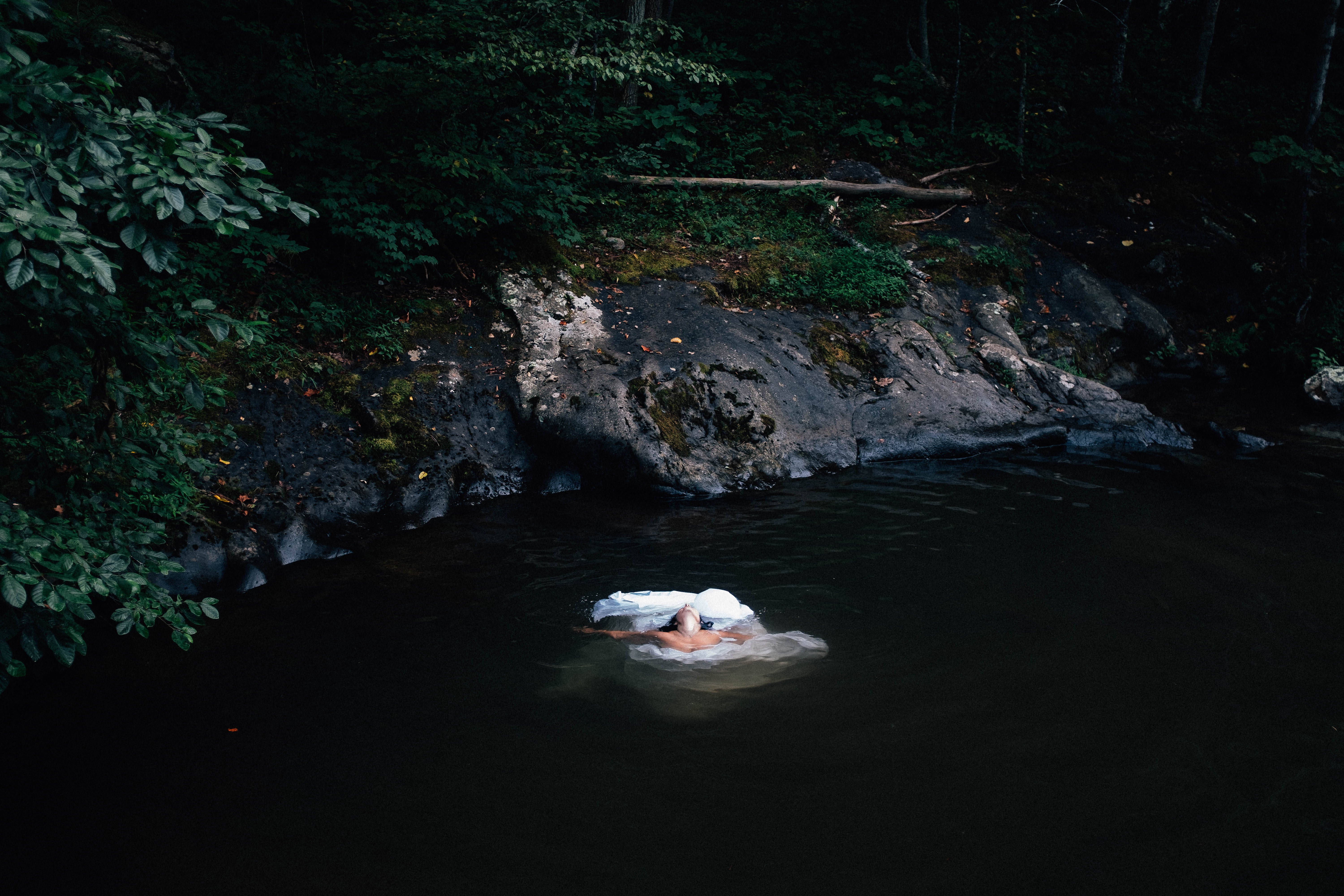A solitary figure floats in the calm, dark waters of a secluded forest pool, enveloped in a delicate white fabric that contrasts against the earthy tones of the surrounding rocks and lush greenery. The moody, diffused light captures the tranquil yet introspective atmosphere, evoking a sense of solitude and connection to nature. The composition draws the eye toward the floating subject, emphasizing both vulnerability and peace amid the natural landscape.