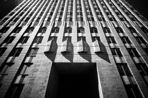 The photograph captures the imposing façade of a towering building, viewed from a low angle that emphasizes its verticality. The interplay of light and shadow across the textured stone reveals intricate architectural details, enhancing the dramatic mood. In monochrome, the composition evokes a sense of timeless grandeur and stark elegance, inviting the viewer to reflect on the building's silent stories.