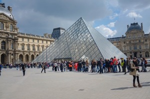 The photograph captures the iconic glass pyramid of the Louvre Museum, surrounded by a lively crowd. The contrast between the modern structure and the classical architecture in the background creates a dynamic visual composition. The soft lighting and scattered clouds evoke a pleasant, inviting atmosphere, highlighting the allure of this artistic landmark.