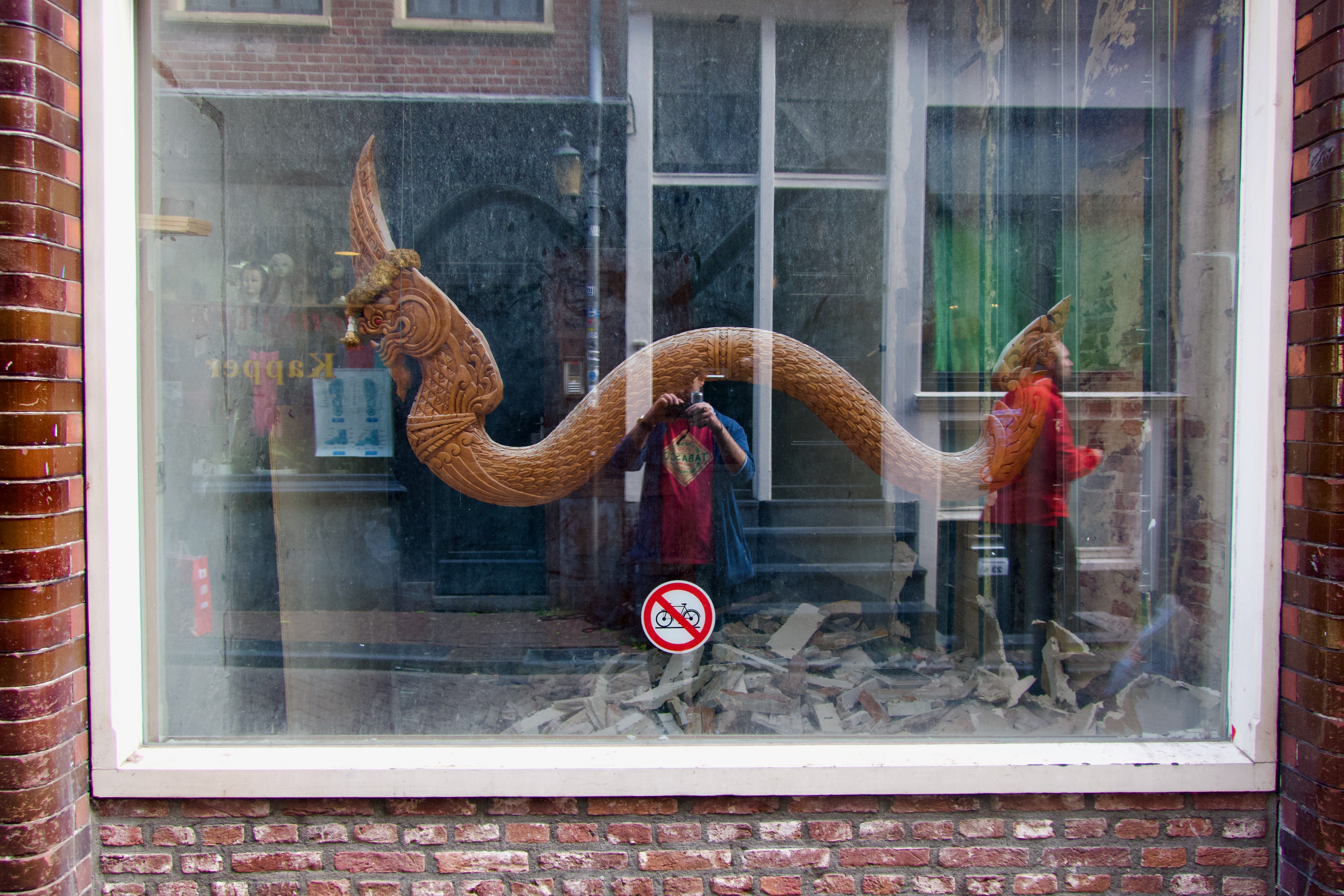A striking dragon sculpture winds through a dusty window, hinting at a world behind the glass. The muted tones and smudged glass create a nostalgic mood, while reflections of onlookers add a layer of interaction to the scene. The juxtaposition of the ornate artwork against the chaotic debris below evokes a sense of both beauty and decay.