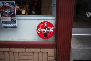 This photograph captures a vibrant Coca-Cola sign affixed to a storefront window, evoking a sense of nostalgia and timelessness. The bright red of the sign pops against the muted tones of the surrounding architecture, drawing the eye with its classic design. Soft natural light gently illuminates the scene, creating a warm and inviting atmosphere that beckons passersby.