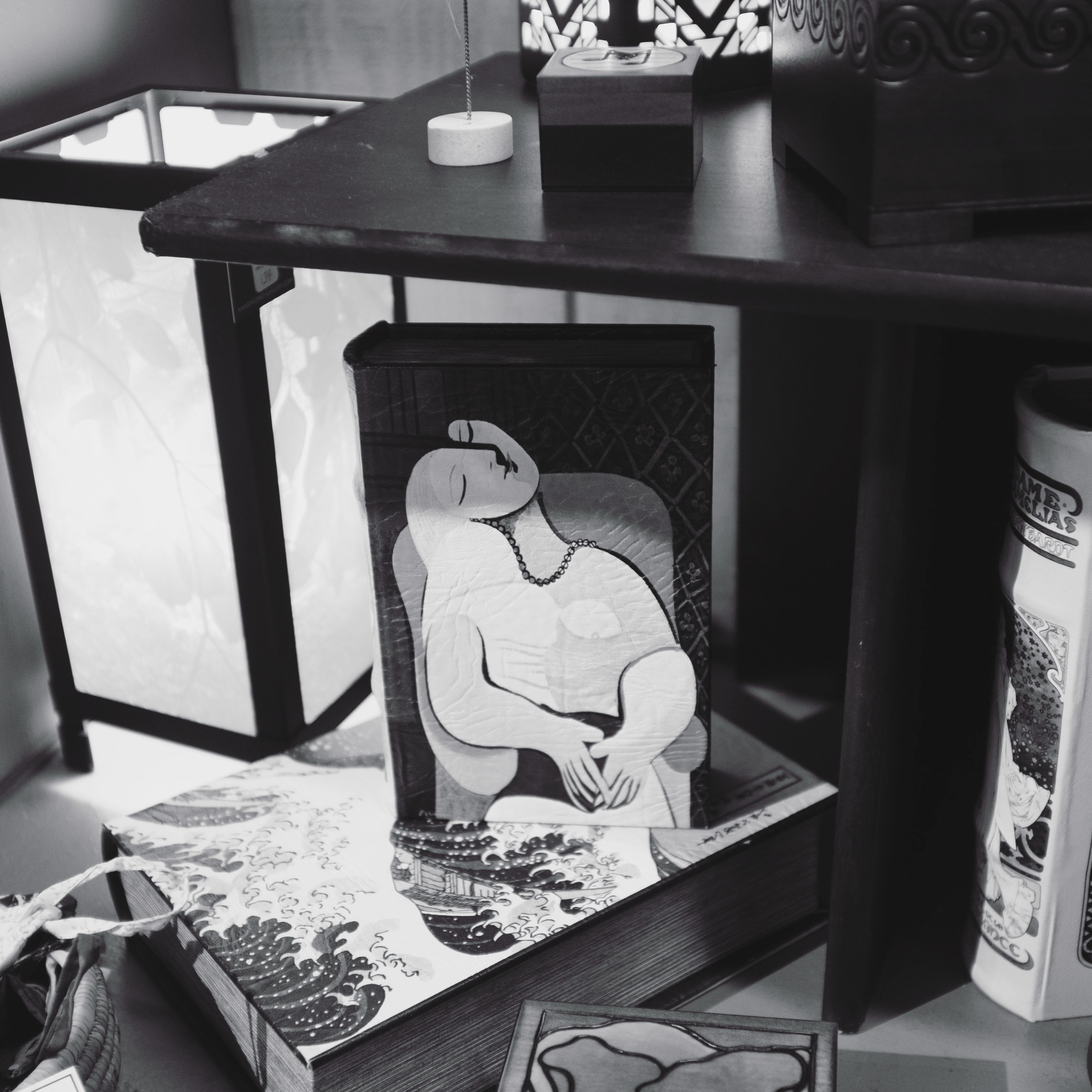 This photograph captures a serene still life with an artistic book leaning against a stack of others, evoking a sense of tranquility. The interplay of shadows and soft lighting from nearby lamps creates a cozy, contemplative mood, inviting the viewer to pause and reflect. The monochromatic tones enhance the timeless quality of the scene, highlighting the elegance of the objects on display.