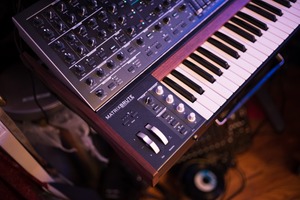 The photograph captures a close-up view of a MATRIXBRUTE synthesizer, showcasing its intricate array of knobs and keys. Soft ambient light bathes the scene, creating a warm and inviting mood that hints at creativity and musical exploration. The composition emphasizes the harmonious interaction between technology and artistry, inviting the viewer to imagine the melodies waiting to be unleashed.