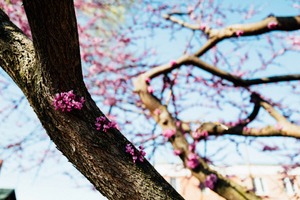 This photograph captures the intricate beauty of a flowering tree, its textured bark partially illuminated by soft daylight. Delicate pink blossoms contrast against the strong, twisted branches, creating a harmonious blend of fragility and resilience. The serene, vibrant mood invites a sense of calm and appreciation for nature's cycles.