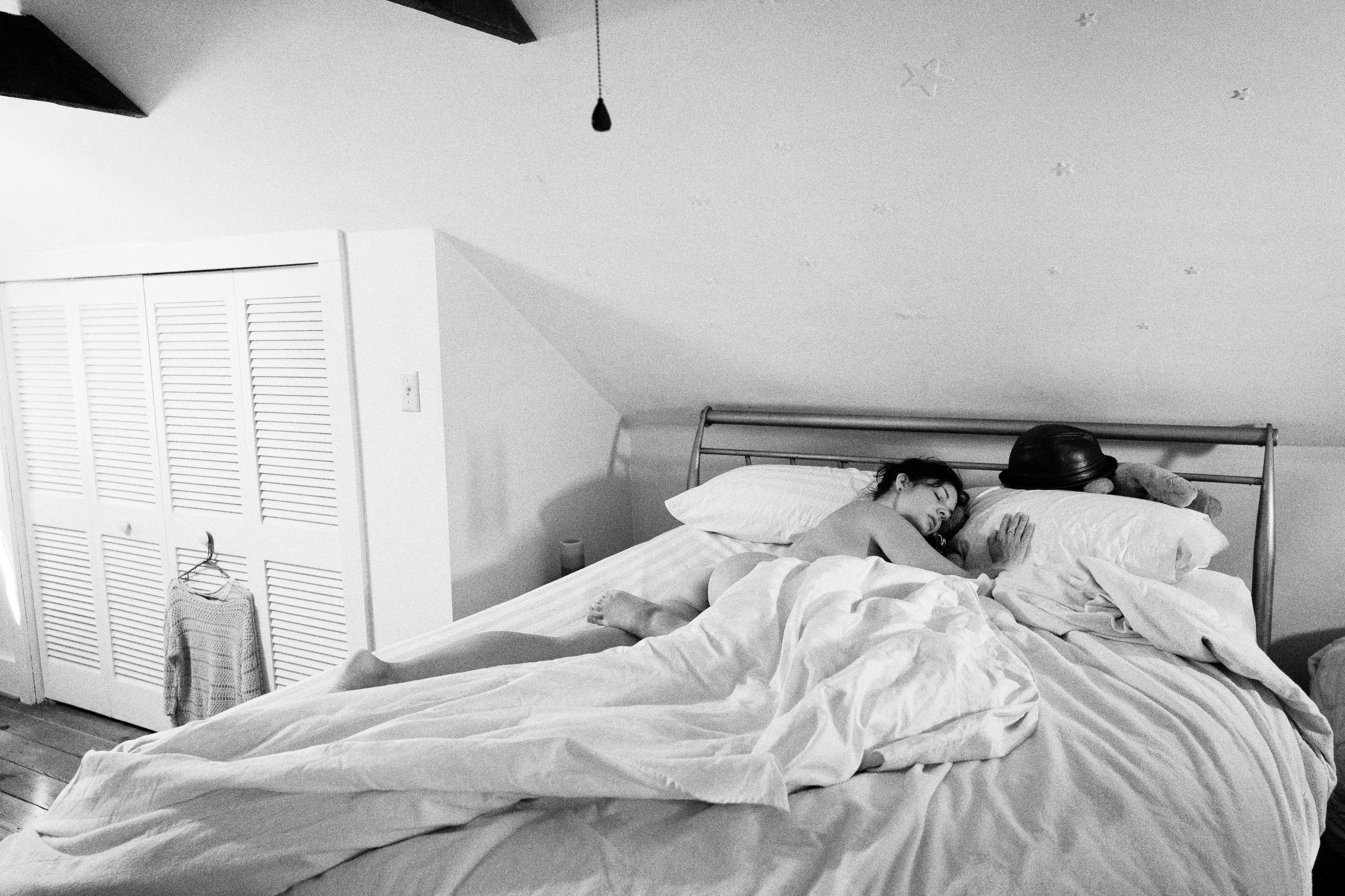 This intimate black-and-white photograph captures a serene moment of slumber, showcasing a figure nestled beneath crisp white sheets against a backdrop of soft lighting. The subtle shadows and muted tones evoke a sense of calm and tranquility in the space, accentuated by the cozy angles of the room. The image speaks to a peaceful stillness, inviting viewers into a private sanctuary of rest.