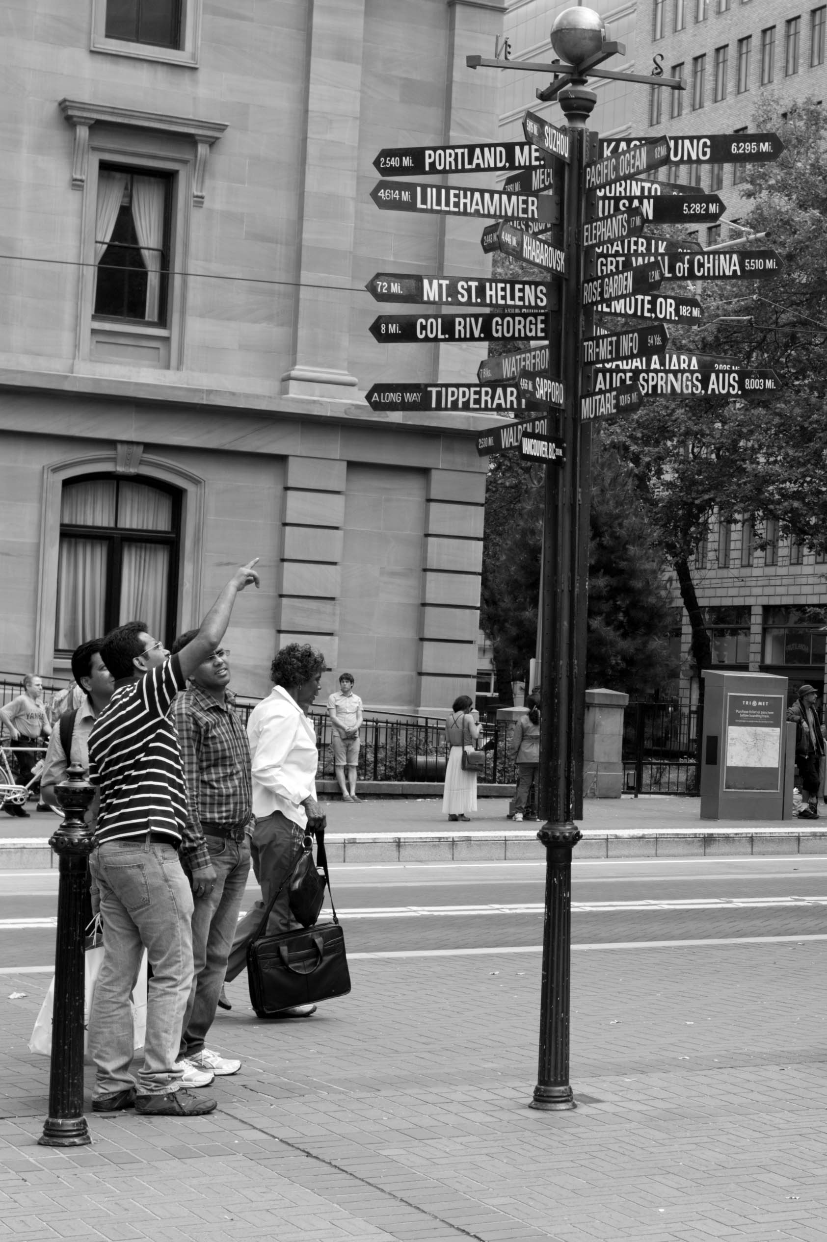 In this black-and-white photograph, a group of individuals gathers around a signpost, their expressions a mix of curiosity and confusion as they point and discuss various distant locations. The urban backdrop, with its historic architecture and distant onlookers, enhances the sense of exploration and serendipity. Soft natural lighting casts gentle shadows, creating a contemplative mood that invites viewers to reflect on the theme of navigation in life.